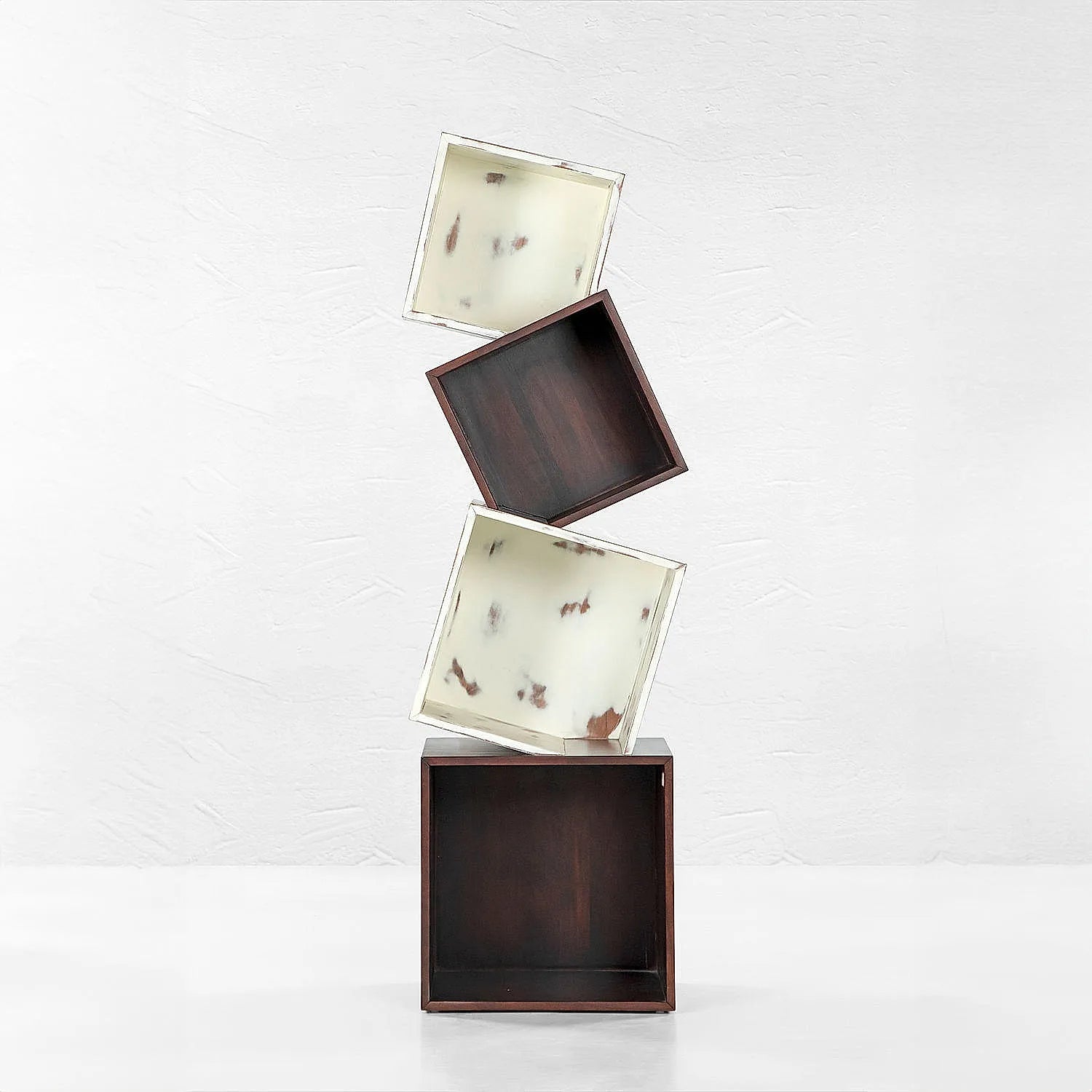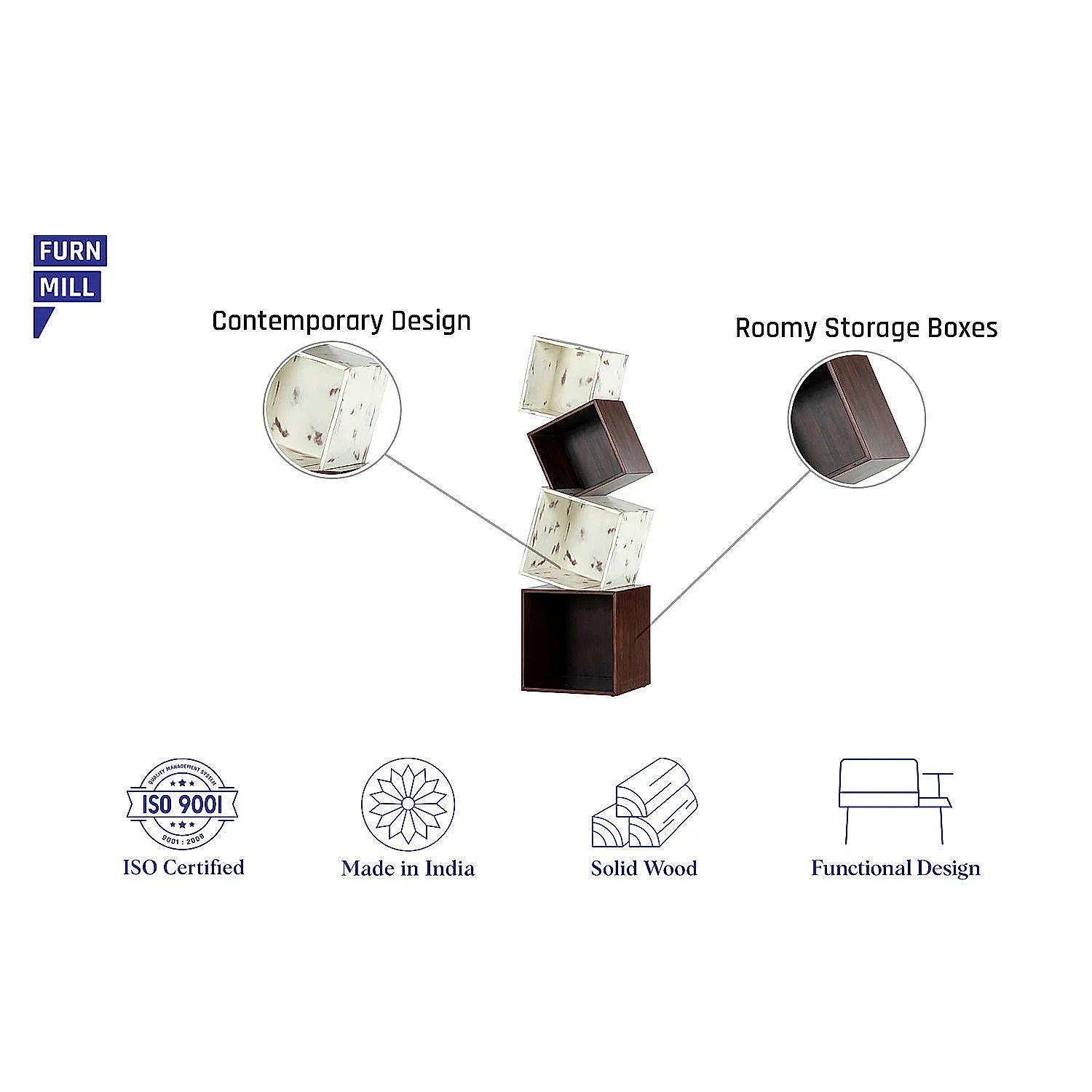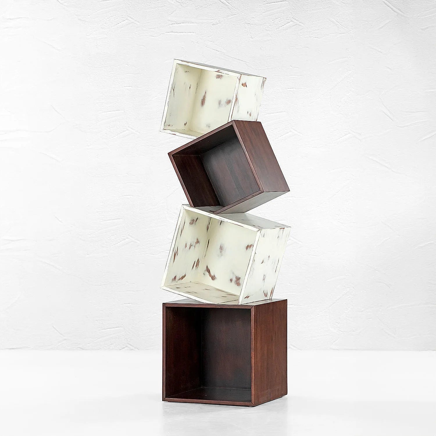 Novel & Urban Design captured the idea of instability and balance. The 4 boxes create a toggled effect to give a home to your books and plants. The distressed finish is subtly contrasted by a clean wood surface making it both versatile and chic.