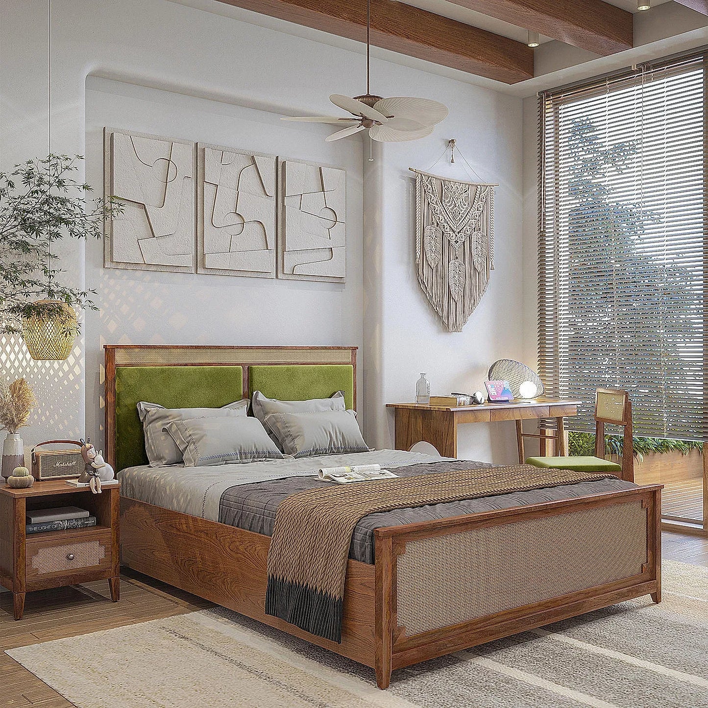The expertly crafted Barrow Rattan Bed without storage, a masterpiece of design and craftsmanship. The swell fabric upholstery on the headboard exudes opulence, while the intricate rattan weave on the footboard adds a touch of artisanal elegance. Immerse yourself in unparalleled grace and sophistication with this exceptional addition to your bedroom.