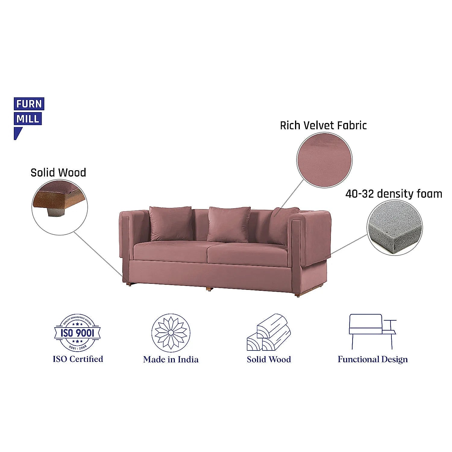 California 3 Seater Fabric Sofa (Velvet, Mauve)