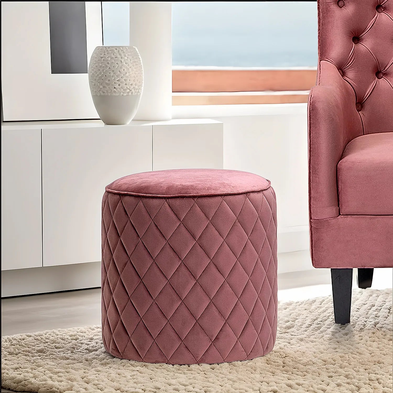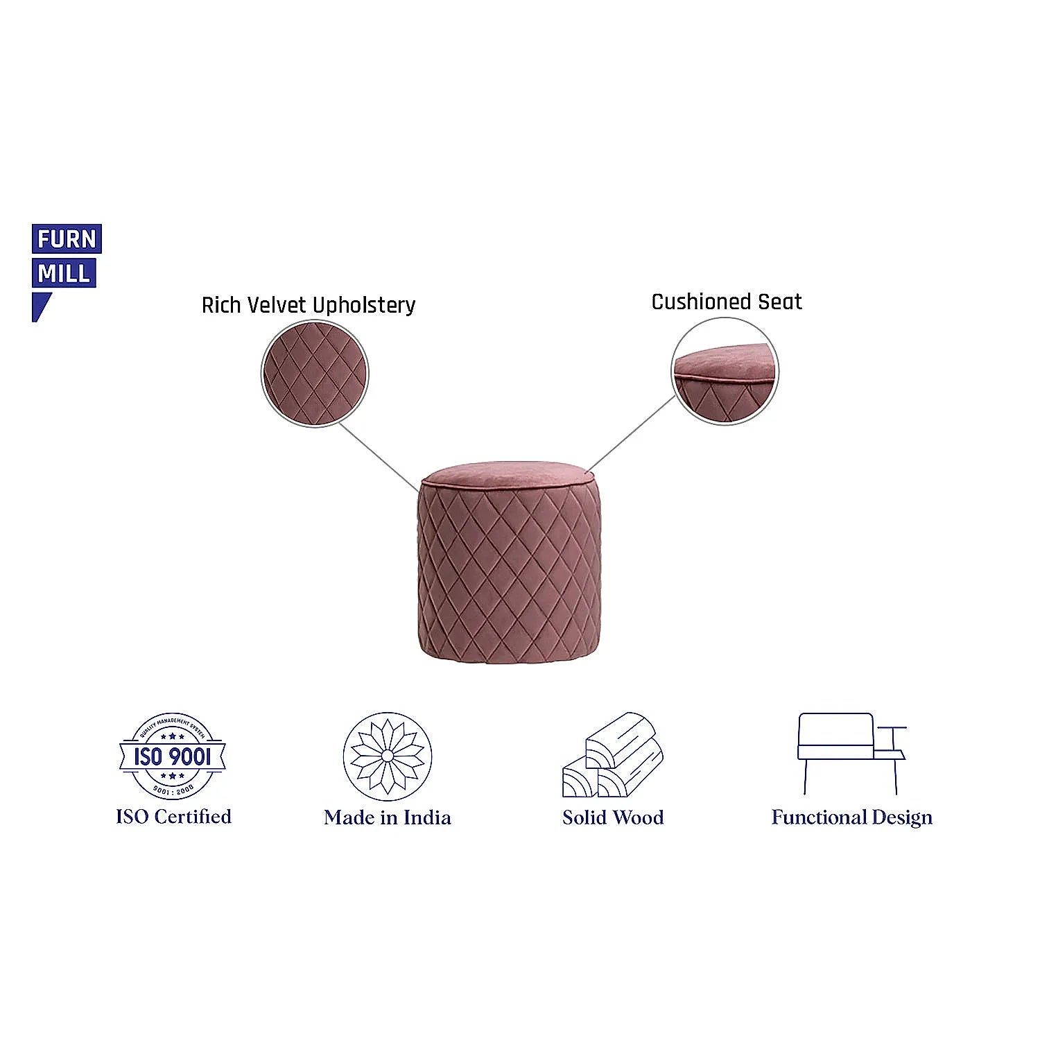 Mable Ottoman from Furnmill adorns a modern design that goes well with any decor style. This upholstered cylindrical-shaped Ottoman uses premium quality soft velvet fabric and is made of materials that are durable, easy to maintain and most importantly, comfortable. Available in mauve color, this classy looking ottoman will definitely give your home visitors a good impression.
