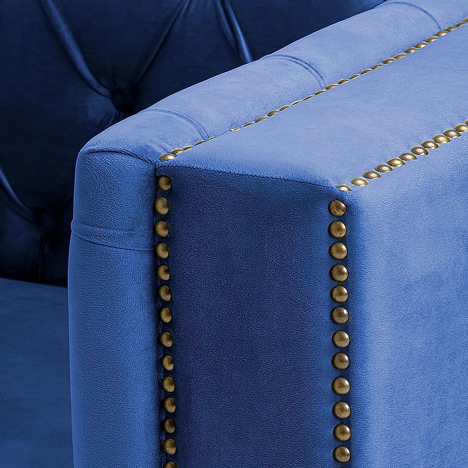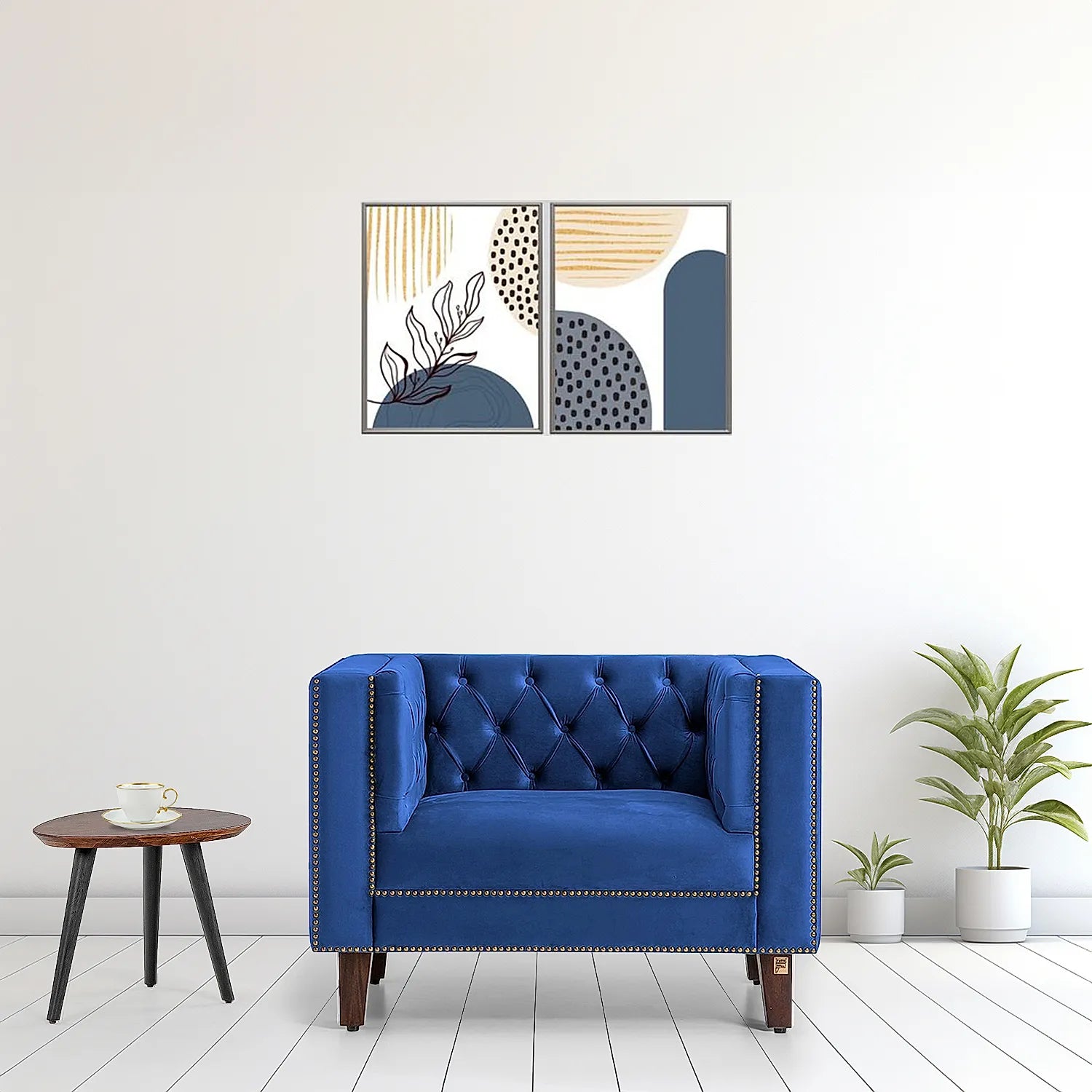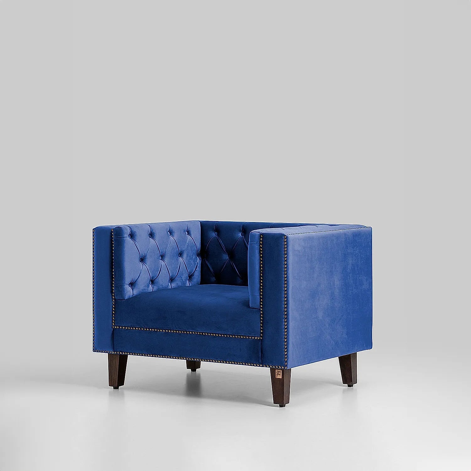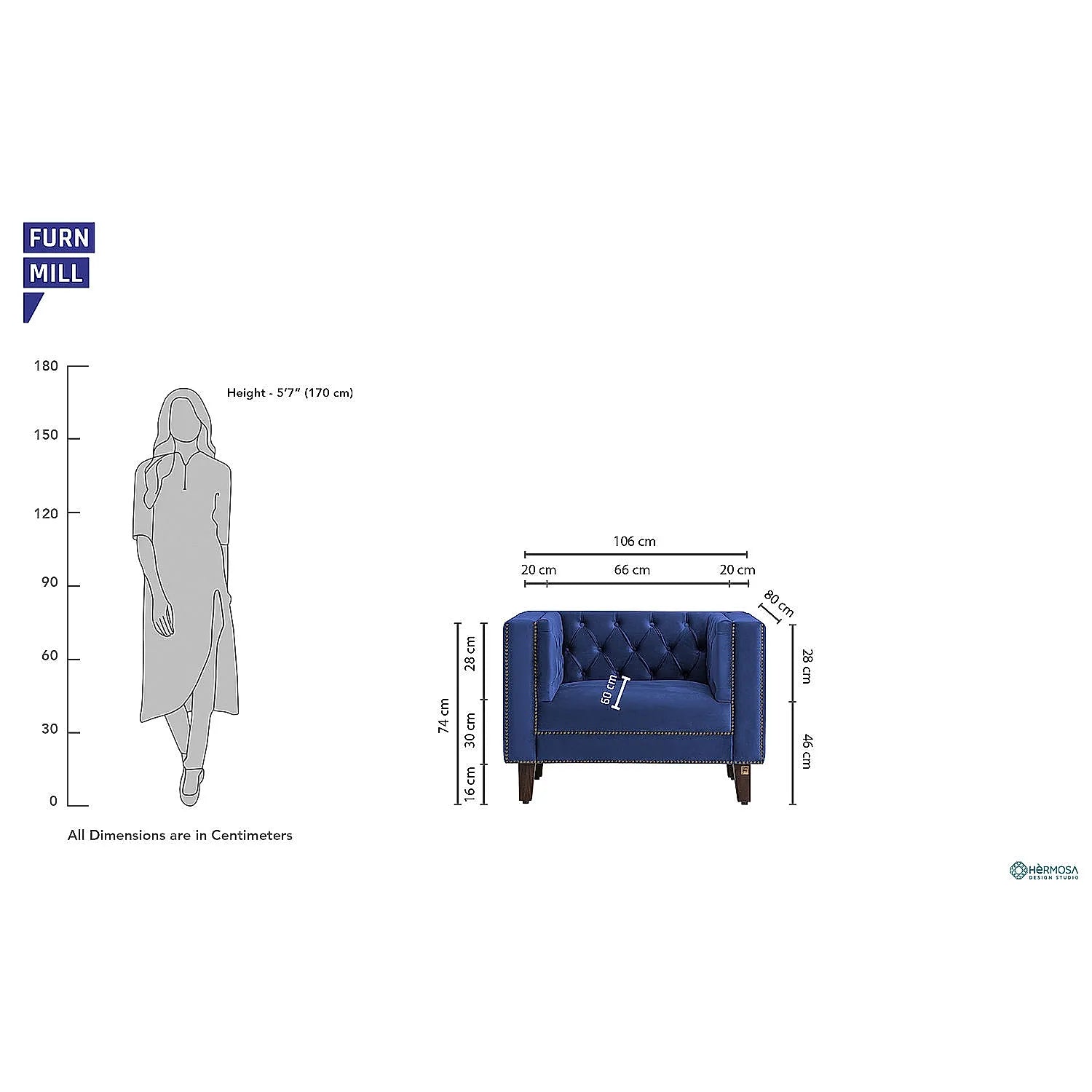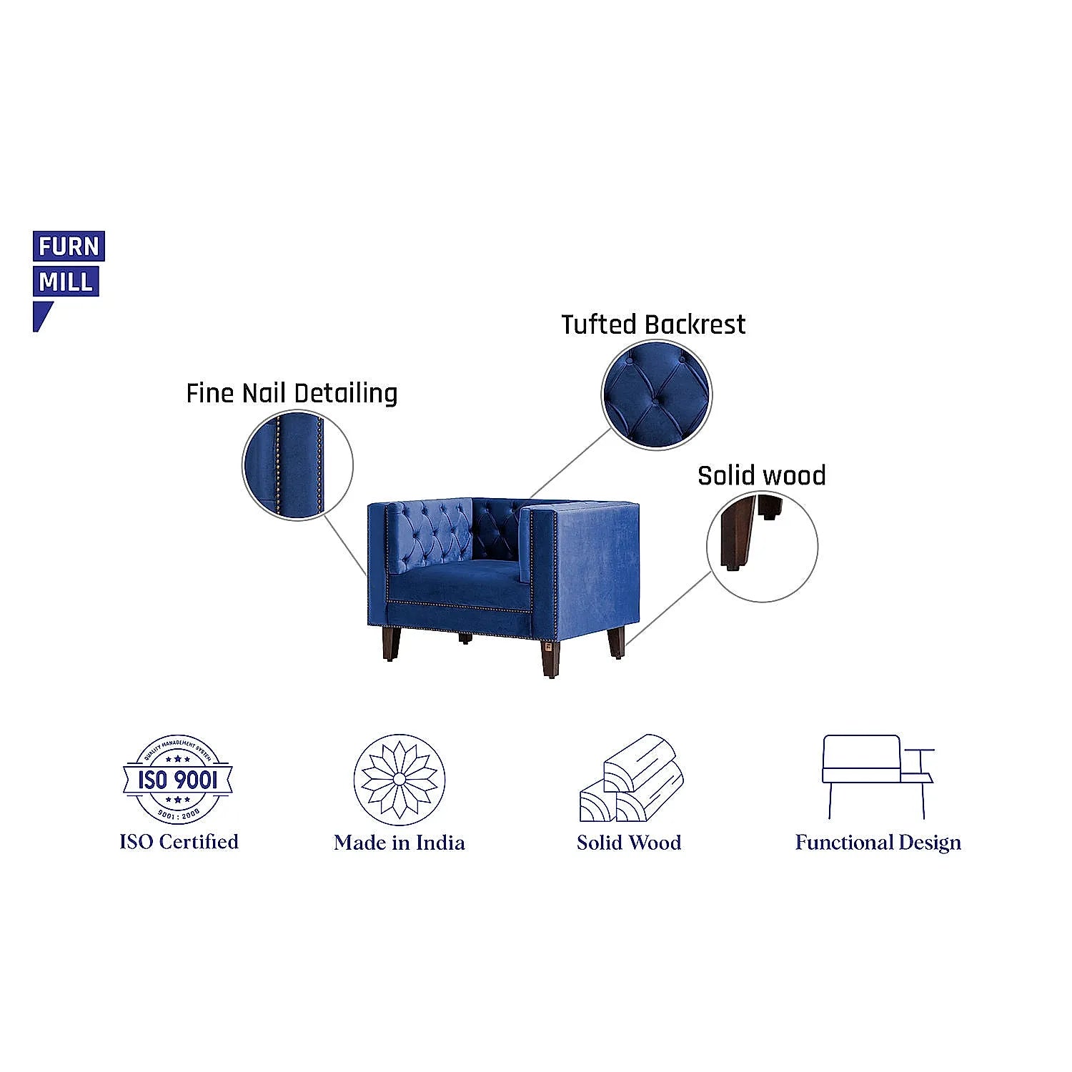 Designed beautifully, this lavish Manchester 1-seater solid wood velvet sofa will turn all heads in the room. Crafted in blue body with dark walnut finished legs, this pretty decorative upholstered furniture is super comfy and pleasurable. The luxe design of this piece is enough to grab the attention of everyone. You can use it with multi-coloured cushions, vibrant throws or even on its own.