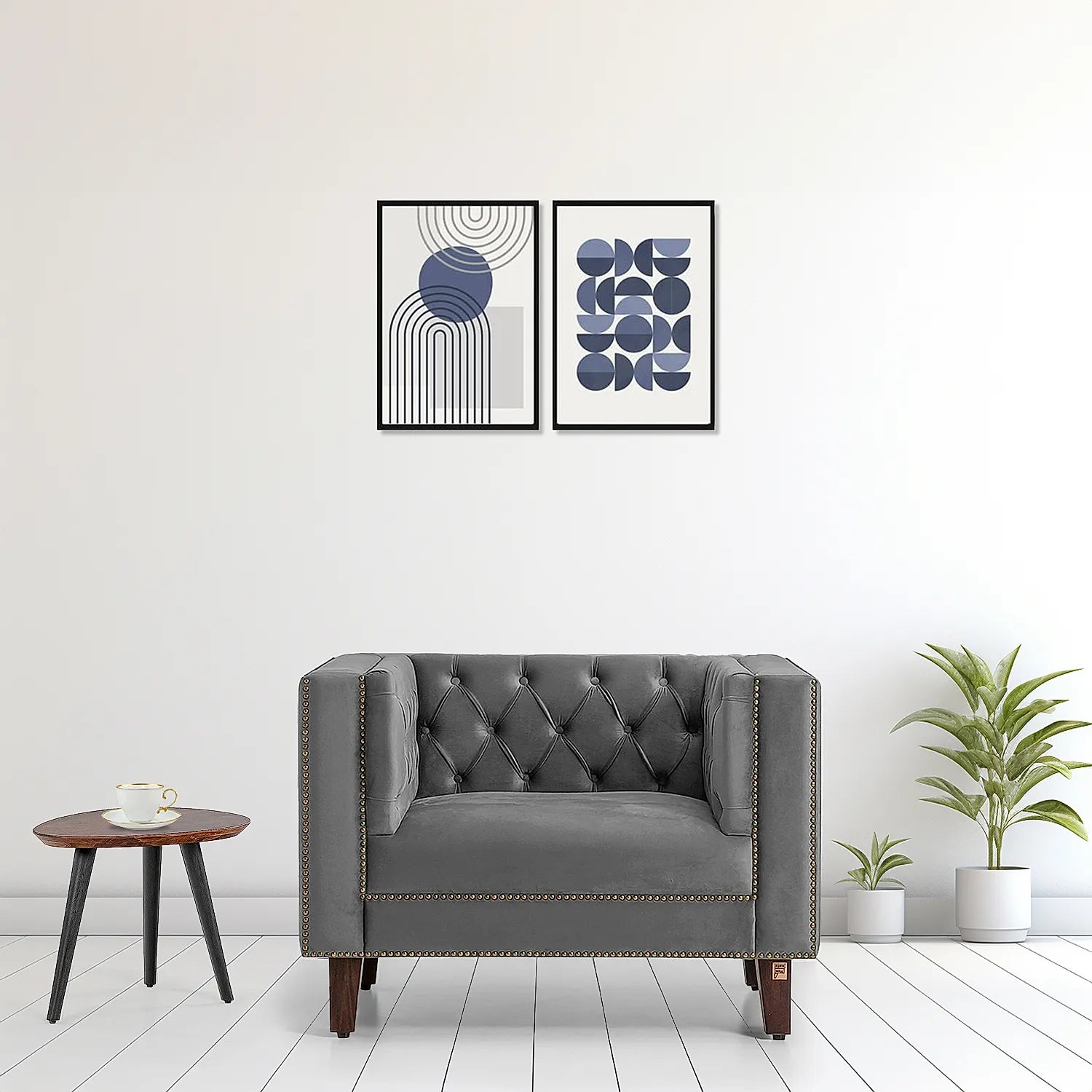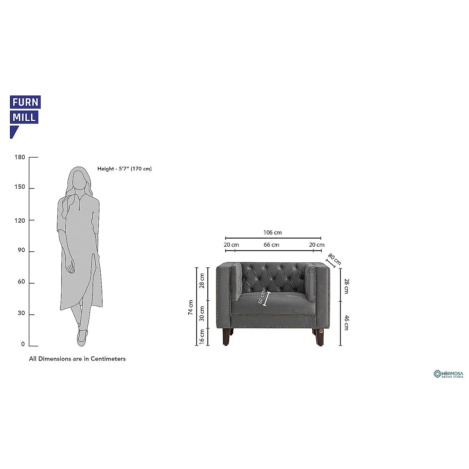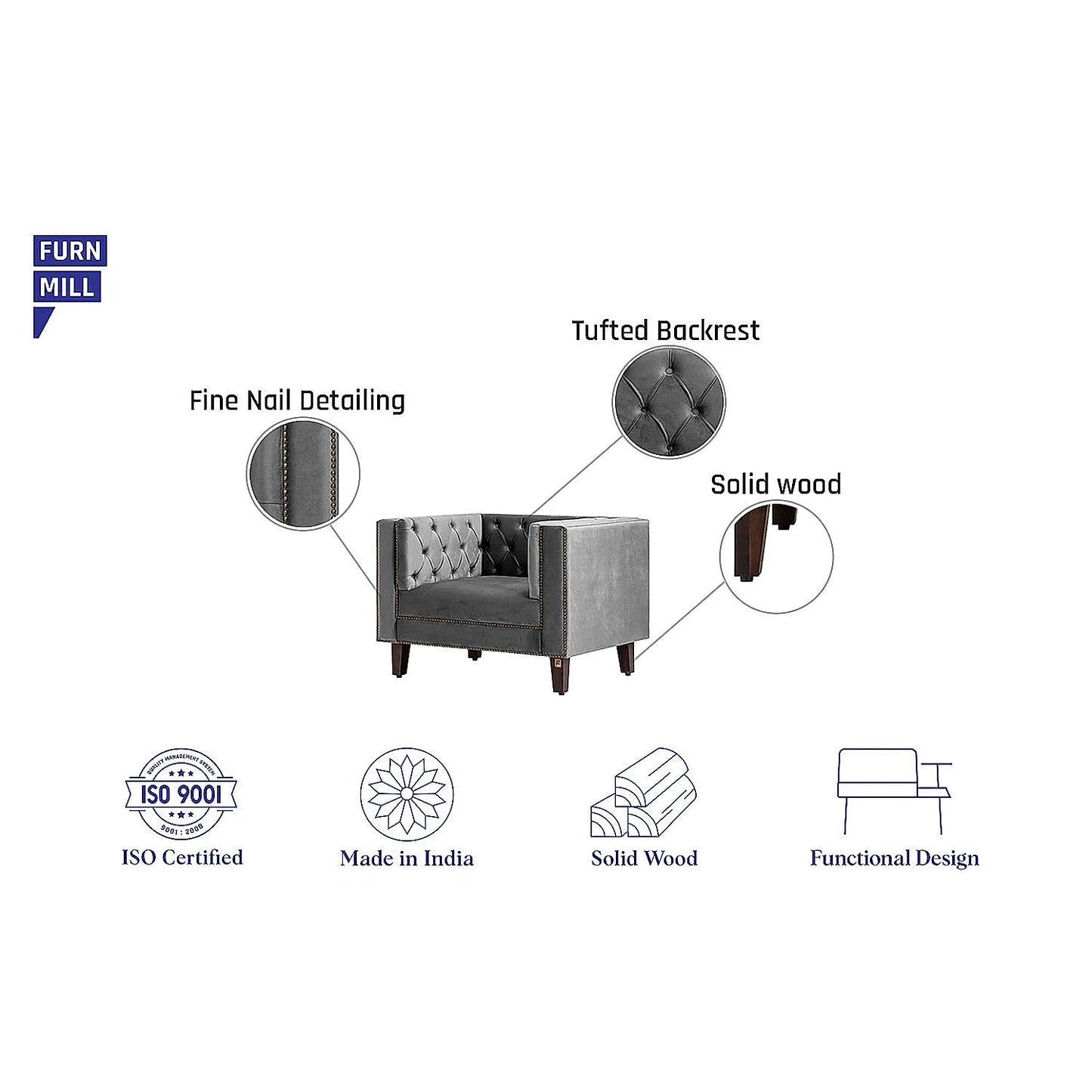 Designed beautifully, this lavish Manchester 1-seater solid wood velvet sofa will turn all heads in the room. Crafted in grey body with dark walnut finished legs, this pretty decorative upholstered furniture is super comfy and pleasurable. The luxe design of this piece is enough to grab the attention of everyone. You can use it with multi-coloured cushions, vibrant throws or even on its own.