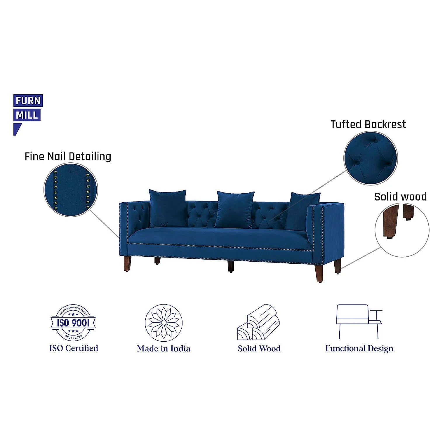 Manchester 3 Seater Wooden Sofa (Velvet, Blue)