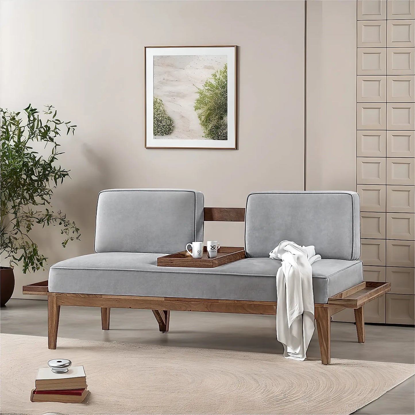 Minika 2 Seater Wooden Sofa (Velvet, Grey)