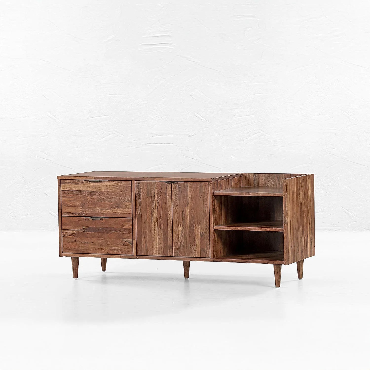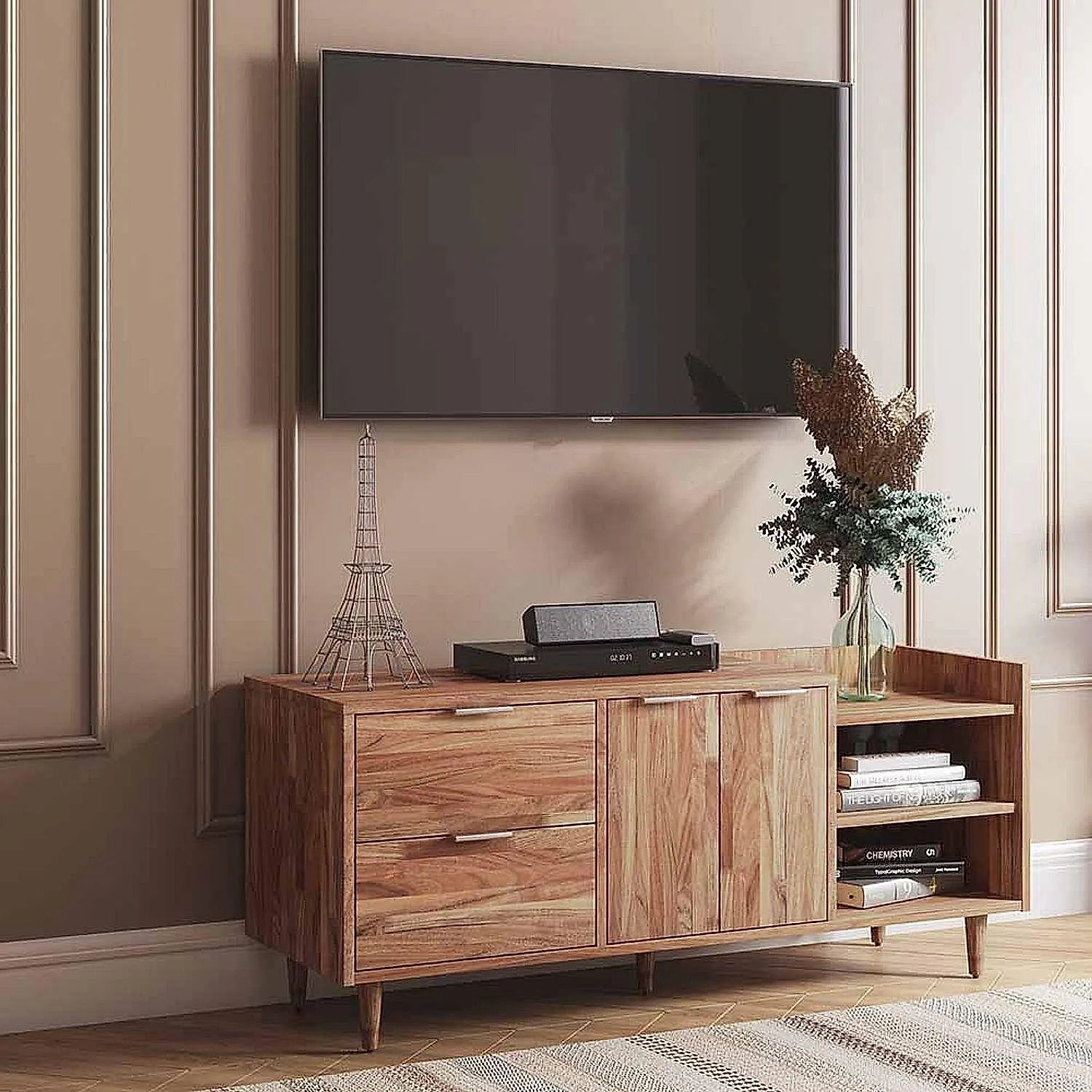 Highly functional Nile TV Unit features drawers, cupboards open shelves for smart storage. The natural wood grains & sturdy solid wood build elevates the look & feel of the entire decor.