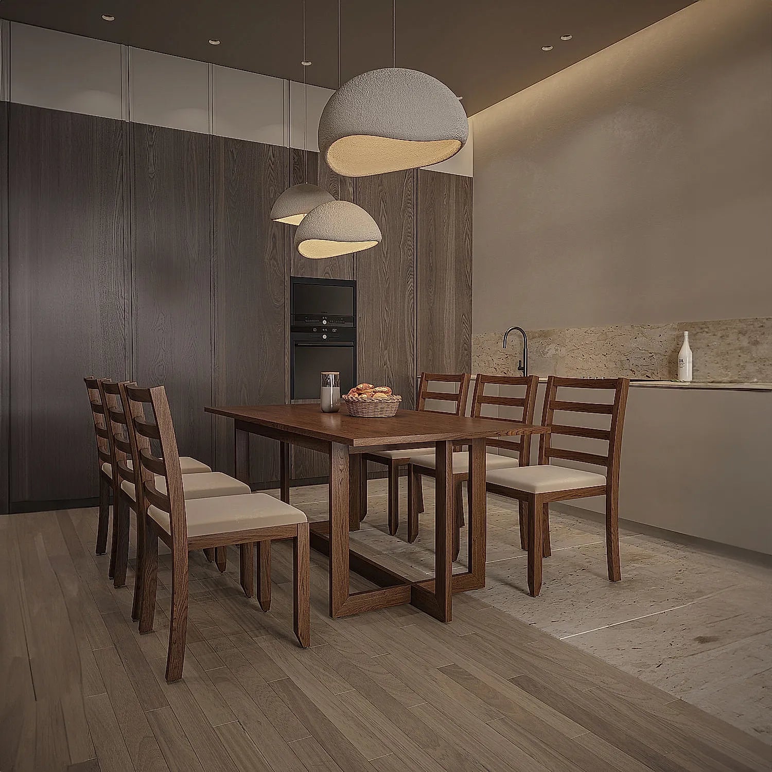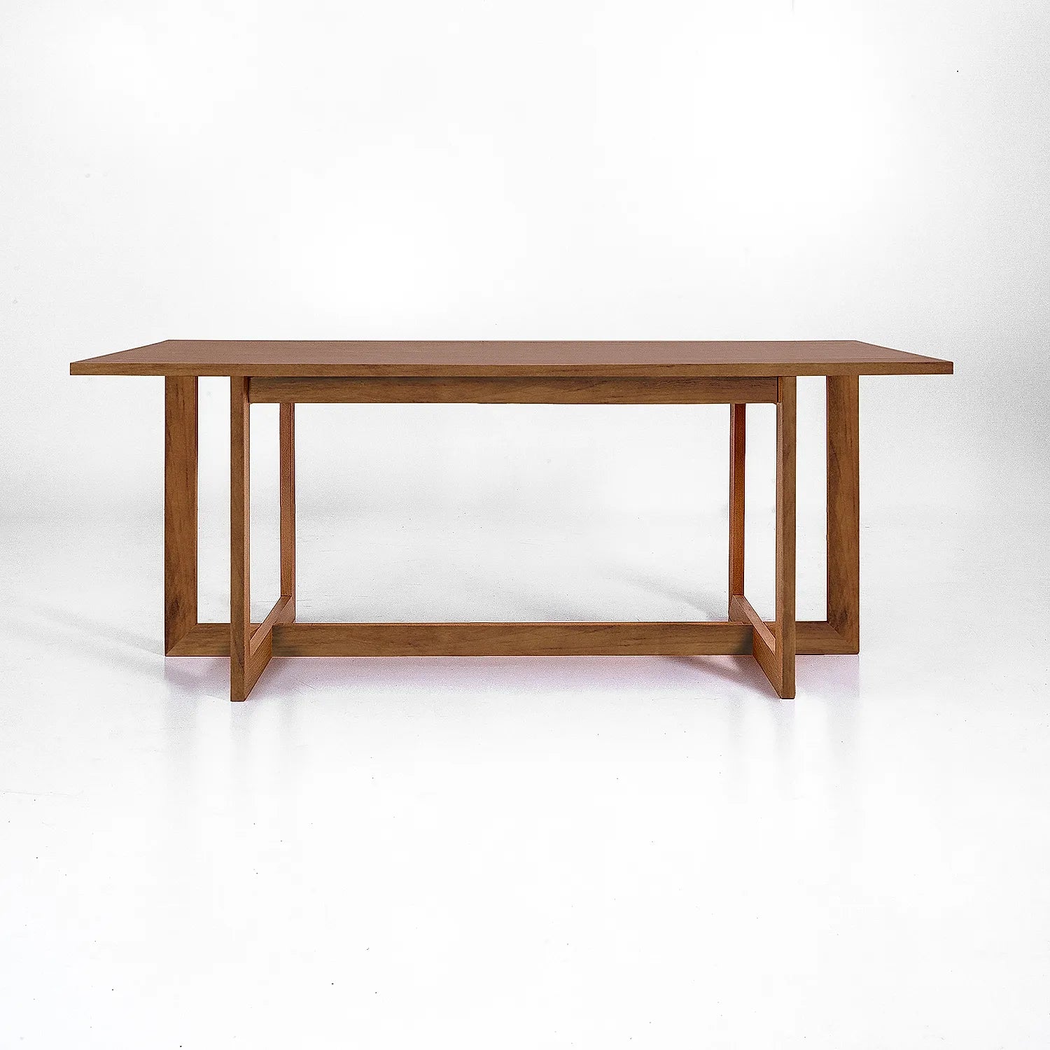 This contemporary dining table features detailing on the base that infuses sleek style. Its rich wooden top and geometric base give it a sophisticated twist, transforming natural materials into a statement piece that’s equal parts rustic and refined. Ideal for both intimate family dinners and larger dinner parties where conversation and laughter flow as freely as the wine.