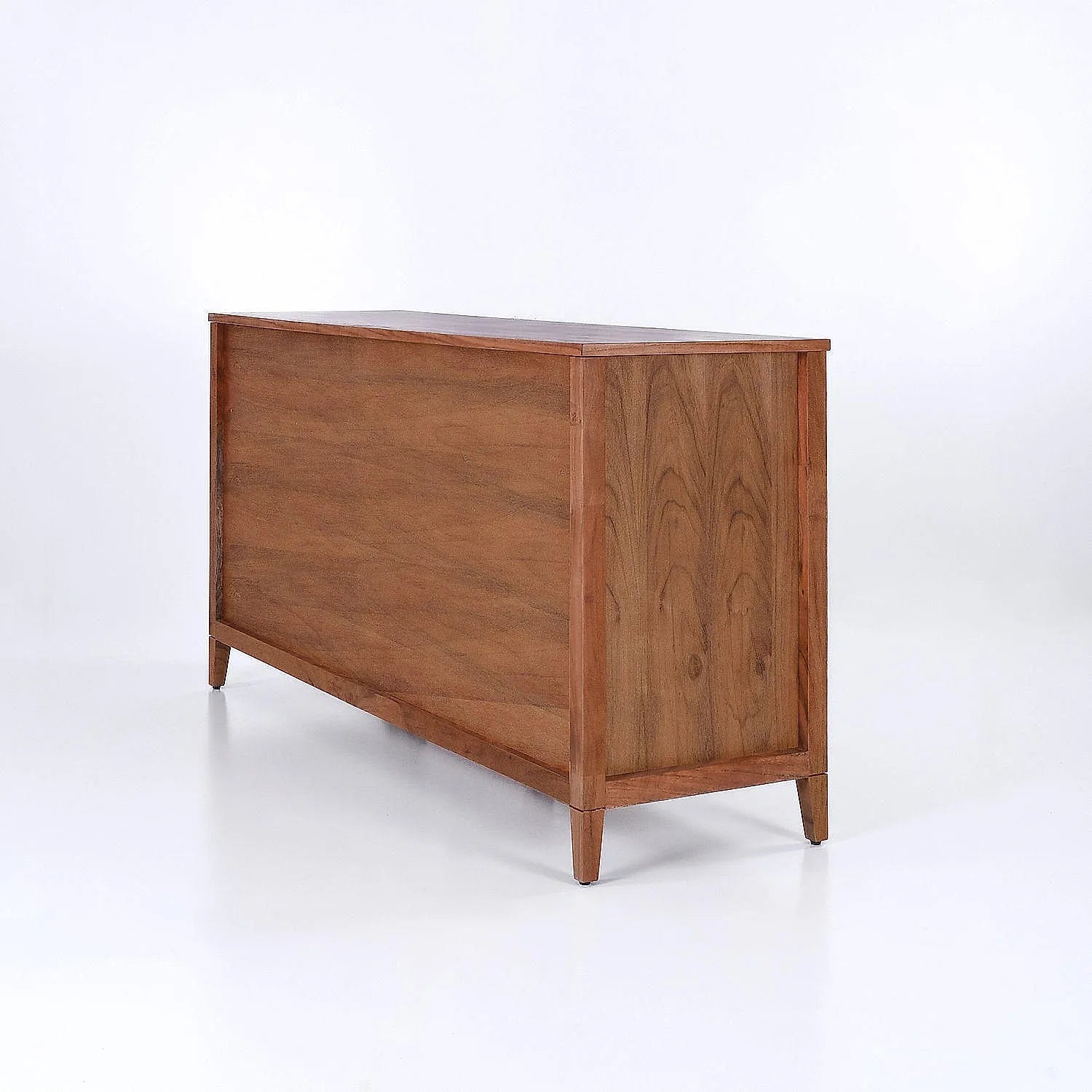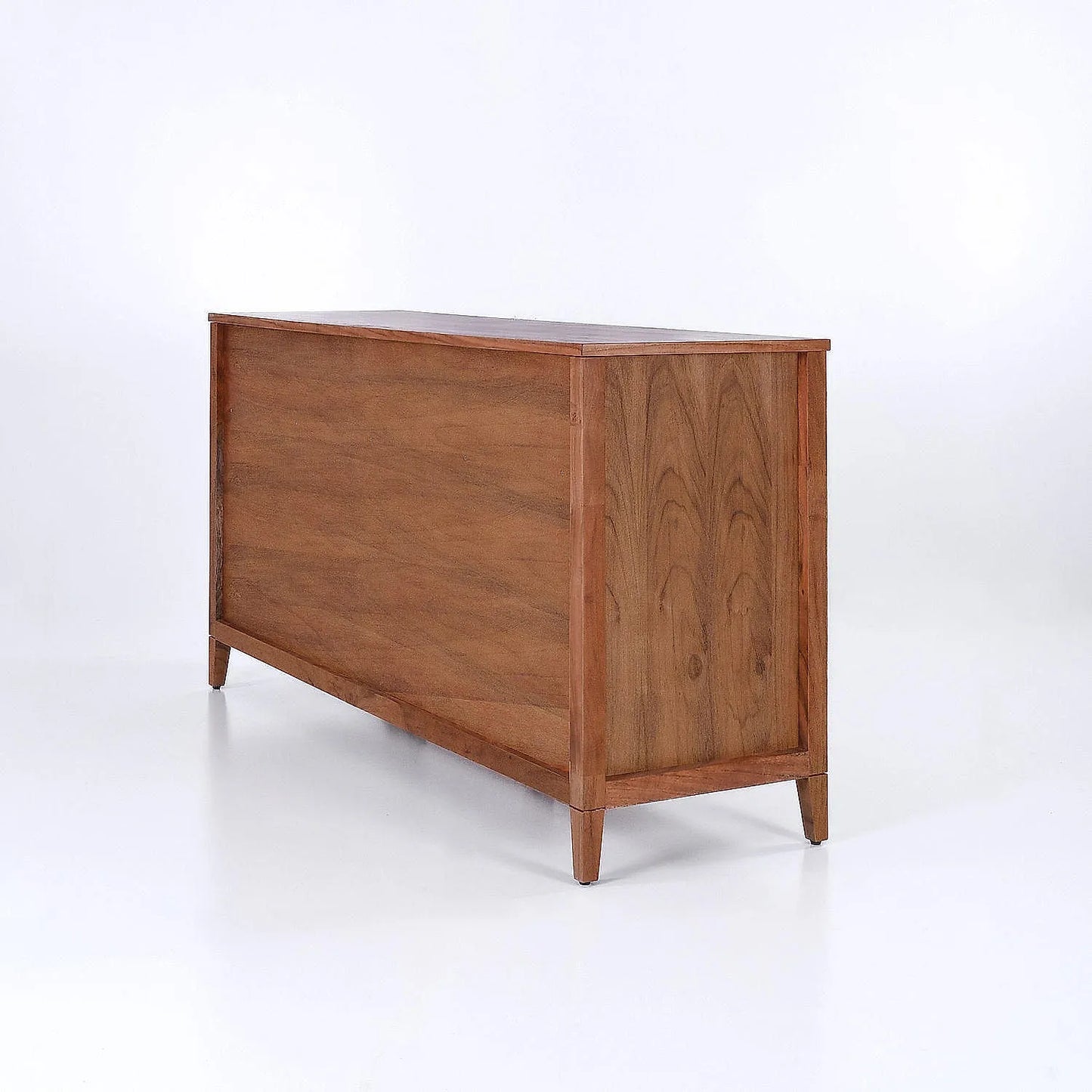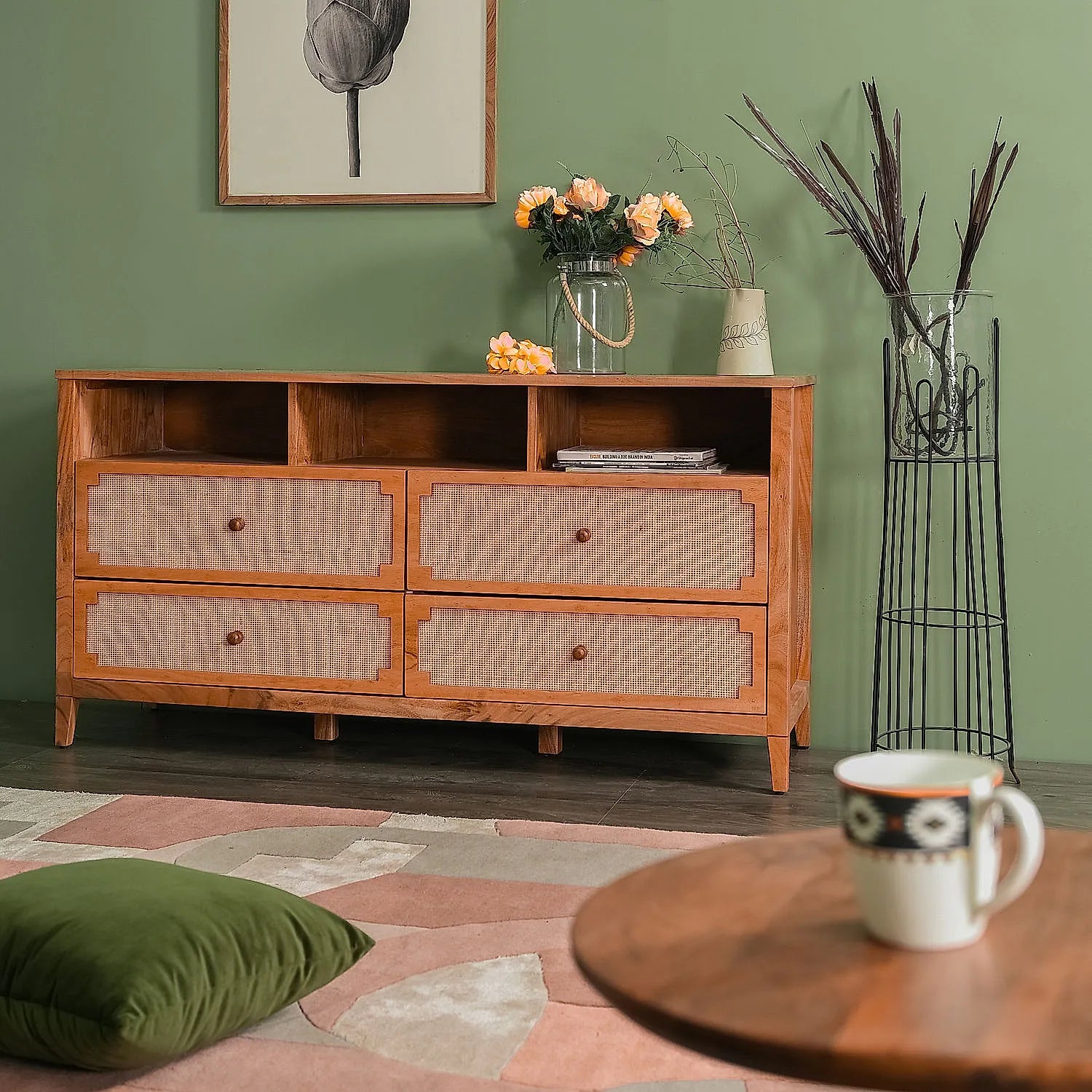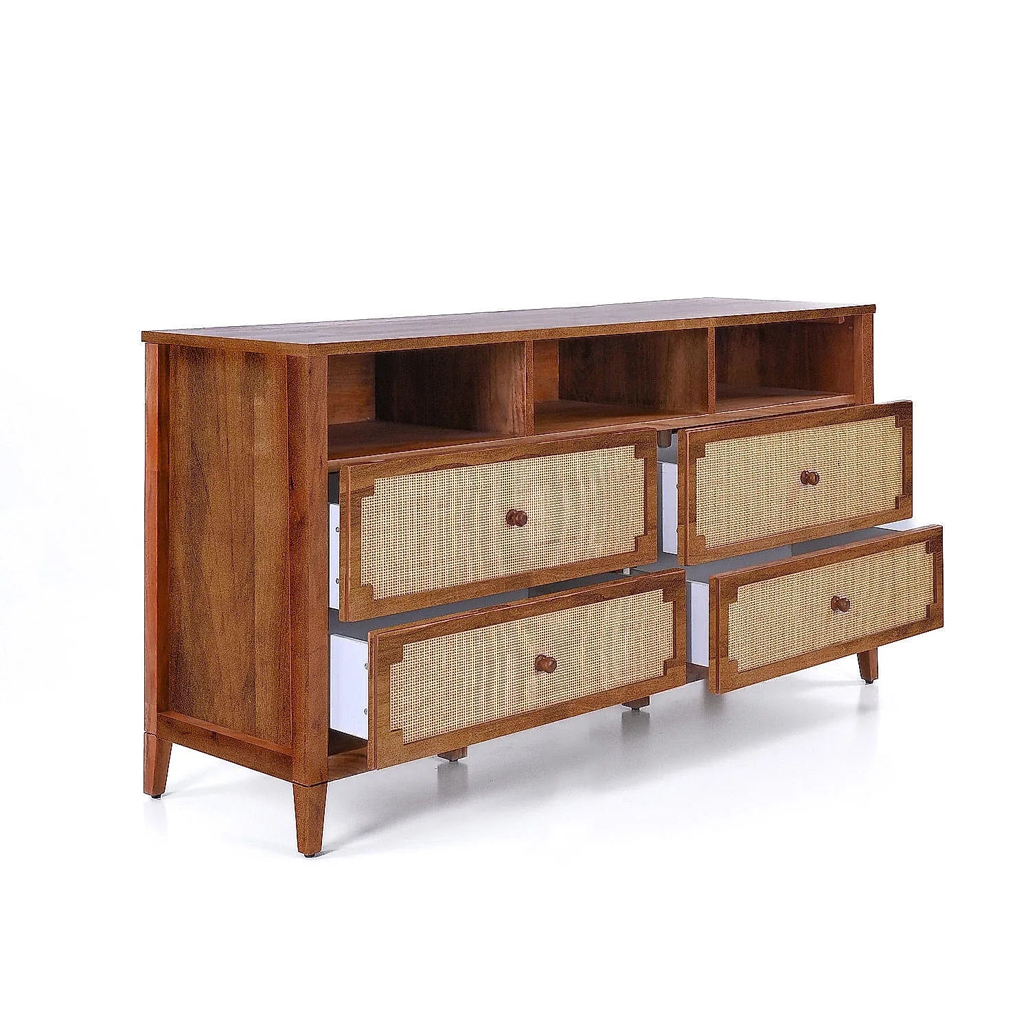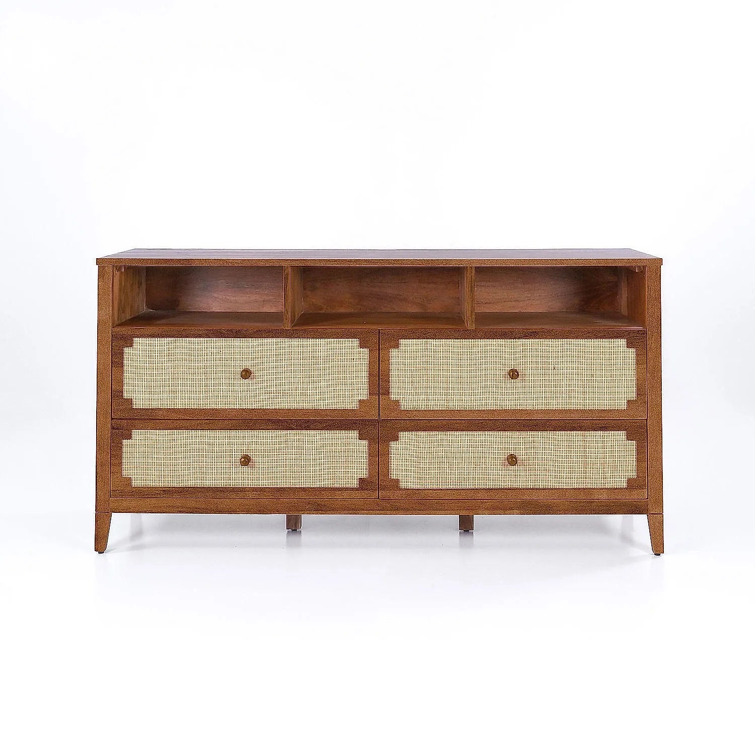 Discover the epitome of artisanal elegance with our meticulously crafted solid wood chest of drawers. Adorned with stunning rattan weaving on the drawer fronts, this masterpiece seamlessly blends natural beauty with exceptional functionality. Embued with timeless elegance, this exquisite piece offers ample storage in form of four smoothly gliding drawers and three shelves. Elevate your living space with this timeless and captivating addition.